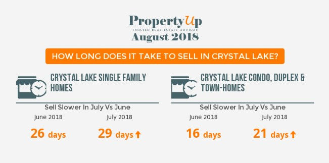 The average market time for a Single Family Homes to sell in Crystal Lake last month was 29 days. It took on average 24 days to sell Crystal Lake Condo, Townhouse or a Duplex. The number of home sales in Crystal Lake from July 1, 2018 through July 31, 2018 was 93 units. That is 1% above the number of homes sold last month in Crystal Lake.