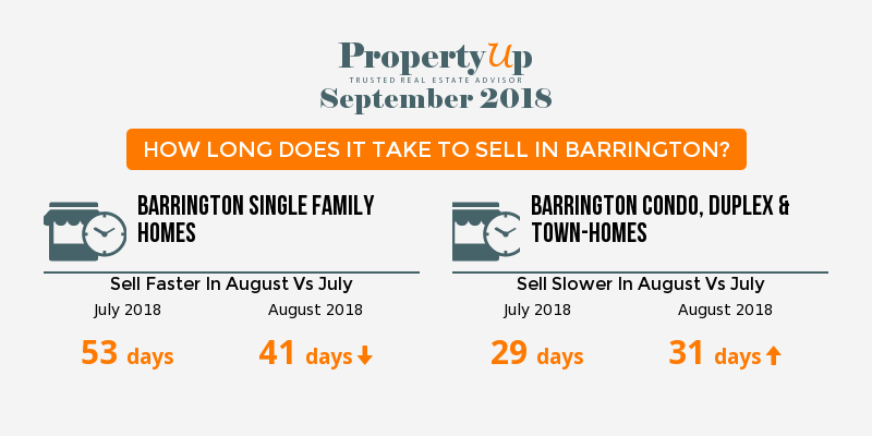 The average market time for a Single Family Homes to sell in Barrington last month was 42 days. It took on average 32 days to sell Barrington Condo, Townhouse or a Duplex. The number of home sales in Barrington from August 1, 2018 through August 31, 2018 was 21 units. That is 1% above the number of homes sold last month in Barrington.