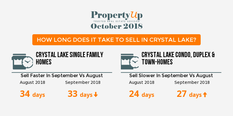 The average market time for a Single Family Homes to sell in Crystal Lake last month was 34 days. It took on average 28 days to sell Crystal Lake Condo, Townhouse or a Duplex. The number of home sales in Crystal Lake from September 1, 2018 through September 30, 2018 was 80 units. That is 1% above the number of homes sold last month in Crystal Lake.